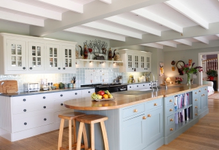 Кухонный гарнитур с комбинированными фасадами: натуральный шпон и матовая эмаль.